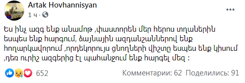 Ես ինչ ազգ ենք անամոթ ,փաստորեն մեր հերոս տղաներին եսպես ենք հարգում, ձայնային ազդանշաններով ենք հողարկավորում ,որդեկորույս ցնողների վիշտը եսպես ենք կիսում ,դեռ ուրիշ ազգերից էլ պահանջում ենք հարգել մեզ ։